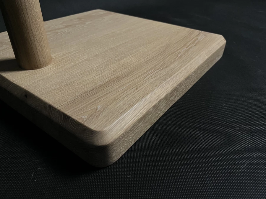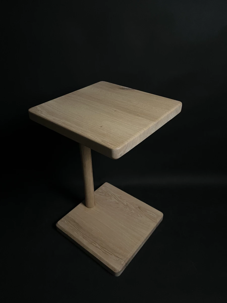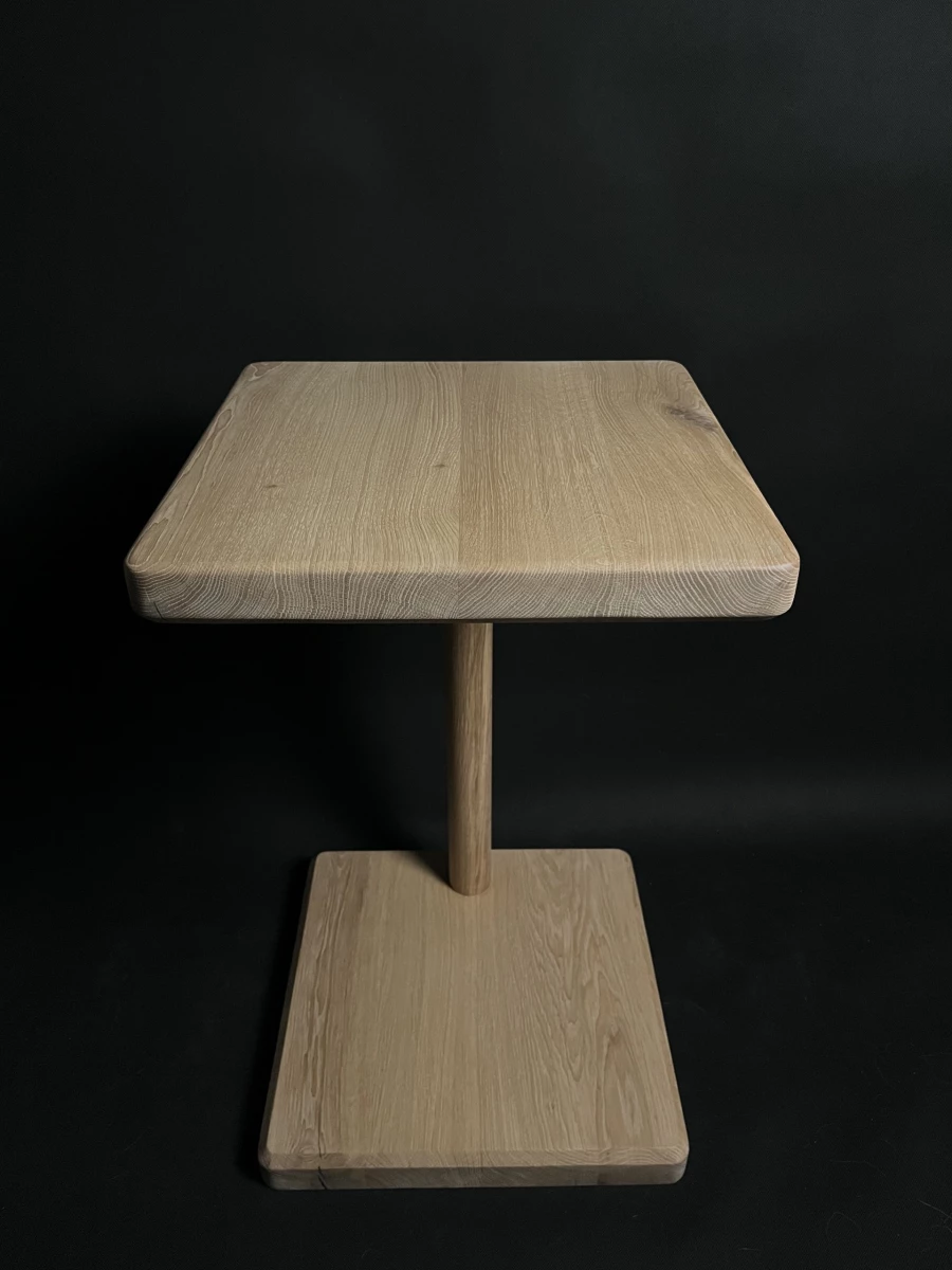 Dębowy stolik boczny — dwa identyczne kwadraty połączone toczoną okrągłą nogą. Miękka górna krawędź blatu, ostre faski na reszcie. 40×40×60 cm, blat 4,5 cm grubości. Wykończenie twardym woskiem (Rubio Monocoat).