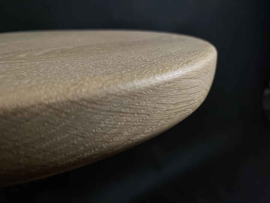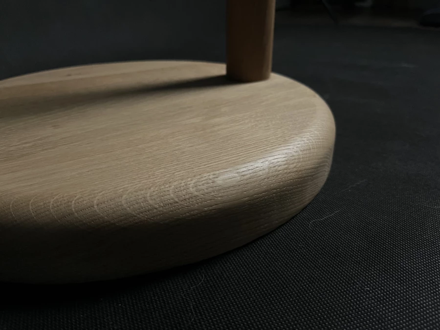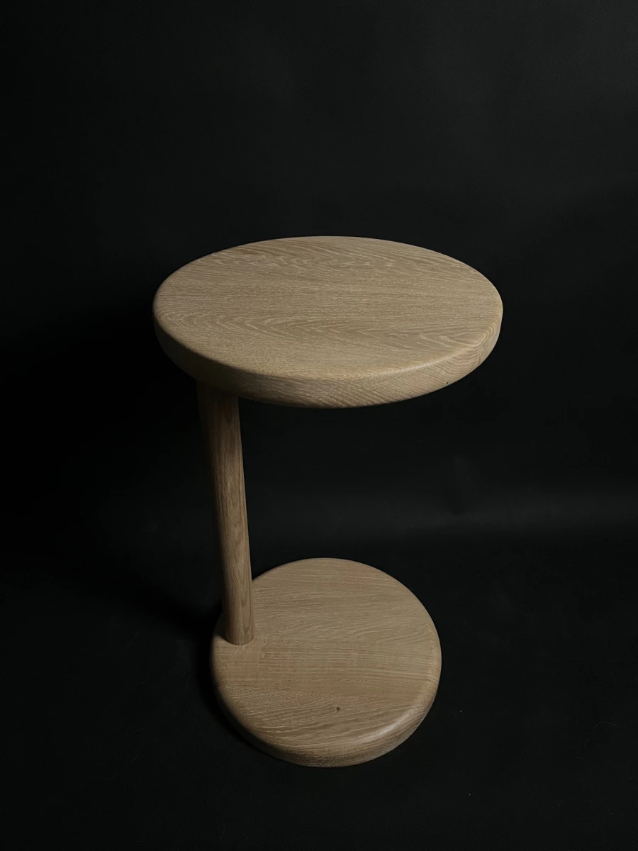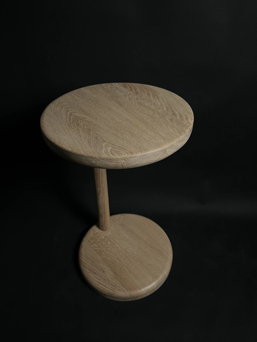 Dębowy stolik boczny — dwa okrągłe blaty połączone jedną toczoną nogą, jak dwa ciała na wspólnej osi. Krawędzie mocno zaokrąglone, blat z widocznym rysunkiem słojów. Średnica blatu i podstawy ⌀40cm, wysokość 60 cm, grubość blatu 4,5 cm. Wykończenie twardym woskiem (Rubio Monocoat).