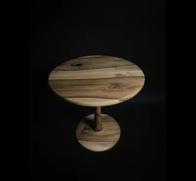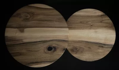 Lite drewno orzecha europejskiego rzeźbione ręcznie — słoje, sęki i przebarwienia przechodzą z jednego blatu na drugi. Dwa okrągłe blaty (⌀53 cm × 51 cm wys. i ⌀46 cm × 46 cm wys.) wycięte z tej samej deski, żeby rysunek drewna był ciągły. Wykończenie twardym woskiem (Rubio Monocoat).