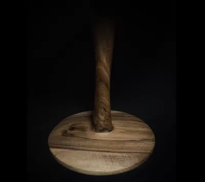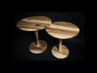 Lite drewno orzecha europejskiego rzeźbione ręcznie — słoje, sęki i przebarwienia przechodzą z jednego blatu na drugi. Dwa okrągłe blaty (⌀53 cm × 51 cm wys. i ⌀46 cm × 46 cm wys.) wycięte z tej samej deski, żeby rysunek drewna był ciągły. Wykończenie twardym woskiem (Rubio Monocoat).